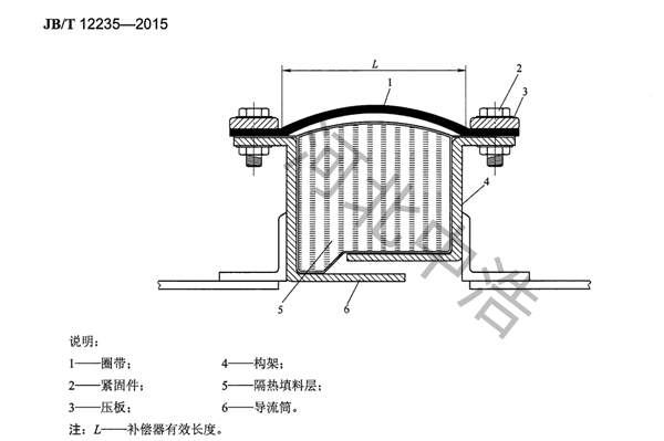 d---------壓板,壓板采用不銹鋼壓板,將圈帶與螺栓緊密連接 ,使其無泄漏 e----------------導(dǎo)流筒,采用加厚不銹鋼,降低直接磨損,增強疲勞次數(shù) f-------------隔熱填料層,加入陶瓷纖維、硅酸鋁和巖棉等,對非金屬補償器起到隔熱作用,降低熱傳遞和適當防塵效果。