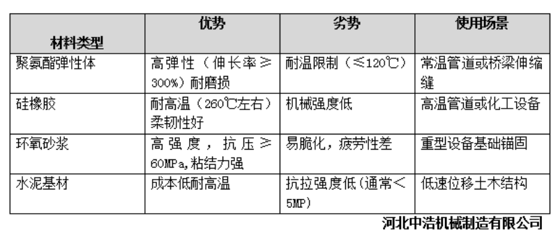 力學(xué)性能主要體現(xiàn)在彈性模量和抗拉抗壓強(qiáng)度以及斷裂韌性,低彈性材料柔韌性好可適應(yīng)較大位移變形,減少應(yīng)力集中,高彈性材料(如混凝土)易因剛性過渡而開裂??估箟簭?qiáng)度高強(qiáng)度材料如(環(huán)氧樹脂)可承受更大載荷和頻繁位移,使用壽命長。而低強(qiáng)度材料易在動態(tài)載荷下疲勞損壞。針對斷裂韌性問題,可用高韌型材料,可抑制微小裂紋引起的斷裂。從耐久性考慮高溫環(huán)境載300℃以上可選用硅酮膠等耐溫材料,普通材料極易發(fā)生脆化??紤]耐化學(xué)腐蝕化工廠環(huán)境需要抗酸堿材料,例如氟橡膠,避免腐蝕失去密封性。而耐腐性需要選擇對紫外線敏感材料如(聚氨酯)添加抗老劑,避免使用開裂現(xiàn)象??紤]界面強(qiáng)度和搜索率,如低粘性材料(如普通水泥砂漿)極易與金屬基體脫粘,導(dǎo)致滲漏。而高收縮材料(如固化環(huán)氧樹脂)可能因收縮應(yīng)力引發(fā)斷裂,需要添加膨脹劑。從膨脹系數(shù)考慮,不同材質(zhì)不同。從施工適應(yīng)性考慮流動性和固化時間,狹窄縫隙需高流動材料,可用自流平聚合物,確使填充緊密。從固化時間考慮,如果搶修時間短可用雙組分聚氨酯,凝聚時間較短。但需要控制施工進(jìn)度。一般情形可參照材料對比表: